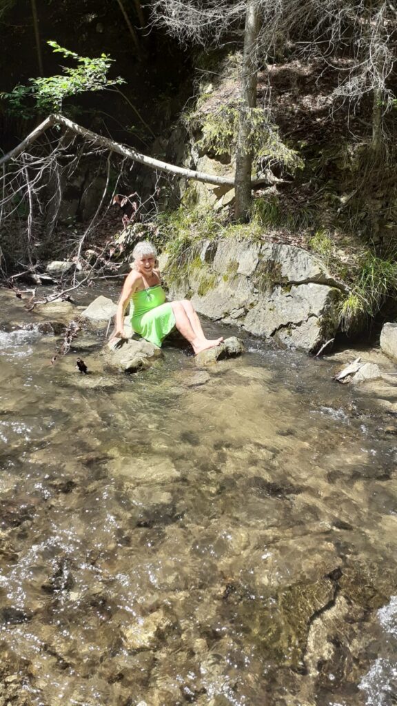 aber mit Aussicht und herrlich frischer Luft. Dann ging es erstmal über 800 m ins Tal mit einem Päuschen und Bachbad
